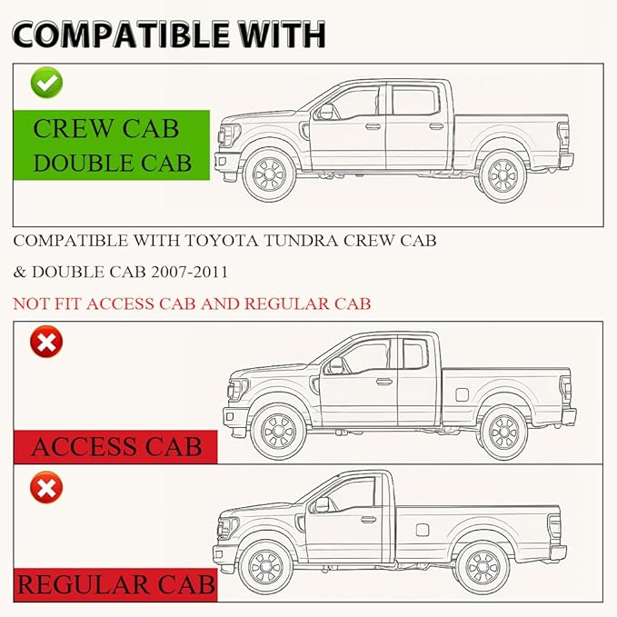 - Vehicle Compatibility - Compatible with Toyota Tundra Double Cab Pickup 2007 2008 2009 2010 2011,Compatible with Toyota Tundra CrewMax Cab Pickup 2007 2008 2009 2010 2011