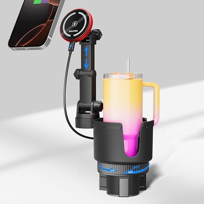 - 【Large Cup Base – Family & Road Trip Ready】The expandable base fits most vehicle cup holders and is designed to hold large water bottles or tumblers alongside your phone. Perfect for road trips, family vehicles, or parents traveling with kids, this cup holder phone mount with magsafe charger keeps essentials organized and phones charged.