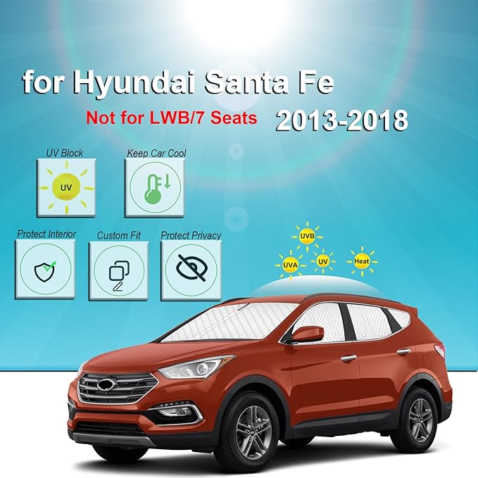 - 【100% Perfect Fit】:The car window shade is specially designed for Hyundai Santa Fe Sport(Not LWB)2013 2014 2015 2016 2017 2018.No Gap,100% Perfect fit.The window shades for the car are designed to cover the whole exterior window,Best for baby in the car and overnight car camping essentials. Protect your car from early morning light disturbances and maintain privacy when car camping(Tips: Please confirm the model of your car before ordering) .
