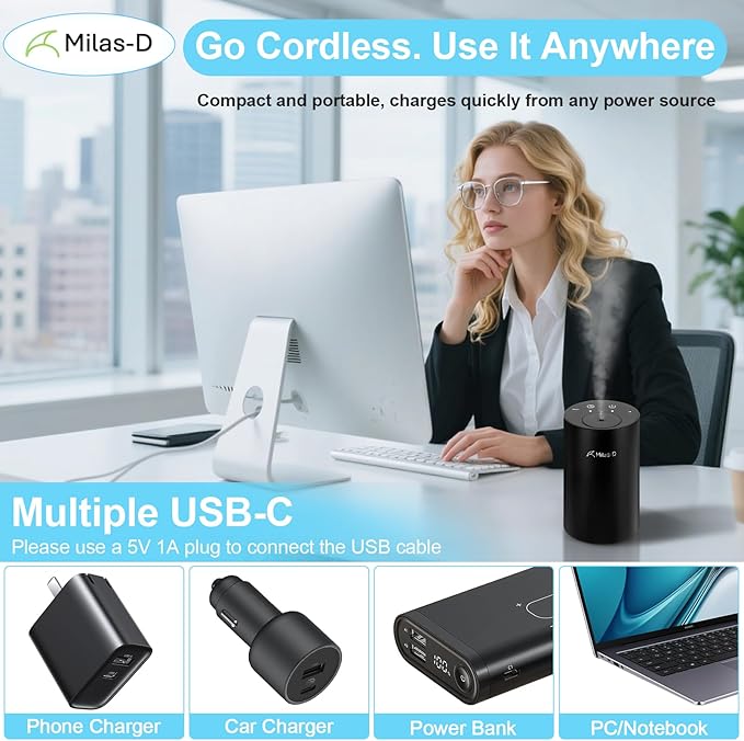 - 【Surprisingly Powerful for Its Size】 This compact portable scent machine comfortably perfumes spaces up to 500 sq ft with natural, undiluted aroma. It works with nearly all diffuser and essential oils on the market, making it a versatile choice for homes, offices, studios, bedrooms, spa rooms, bathrooms, and dining areas. Recharge quickly via USB-C; a typical full charge takes about 3 hours.