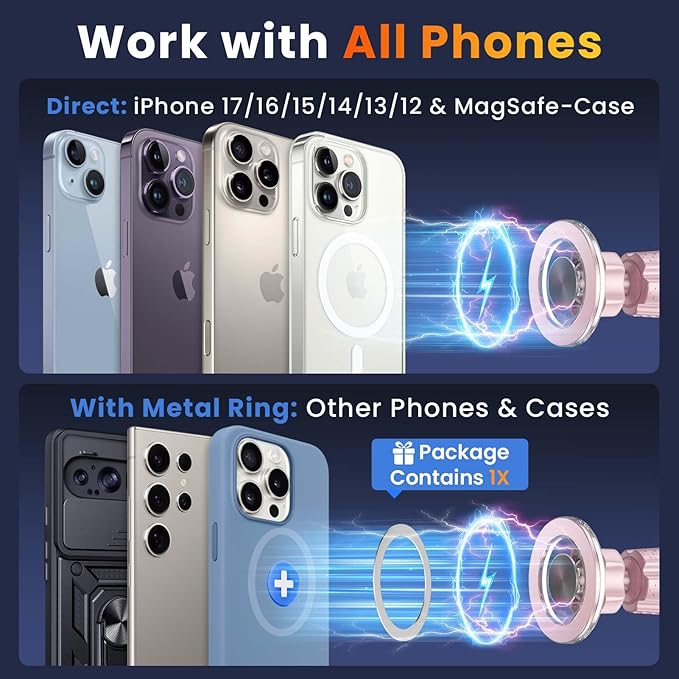 - 2025 Ultra-Strong Magnetic Grip: Powered by super-strong magnets, it can securely hold up to 14 iPhone 17 Pro Max (Note: Use the included metal ring for maximum magnetic strength). Even on the roughest roads, your phone stays firmly in place. The magnets retain their strength at up to 200°F (93°C), with no performance loss in hot weather.