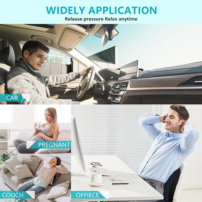 - Pressure Relief & Pain Alleviation: Our seat cushion is meticulously designed to hold up the thighs and hips, significantly reducing direct pressure on the hips, and legs. This unique design feature helps alleviate discomfort from long sitting and driving, making it an ideal choice for long hours of sitting at the office, home or car