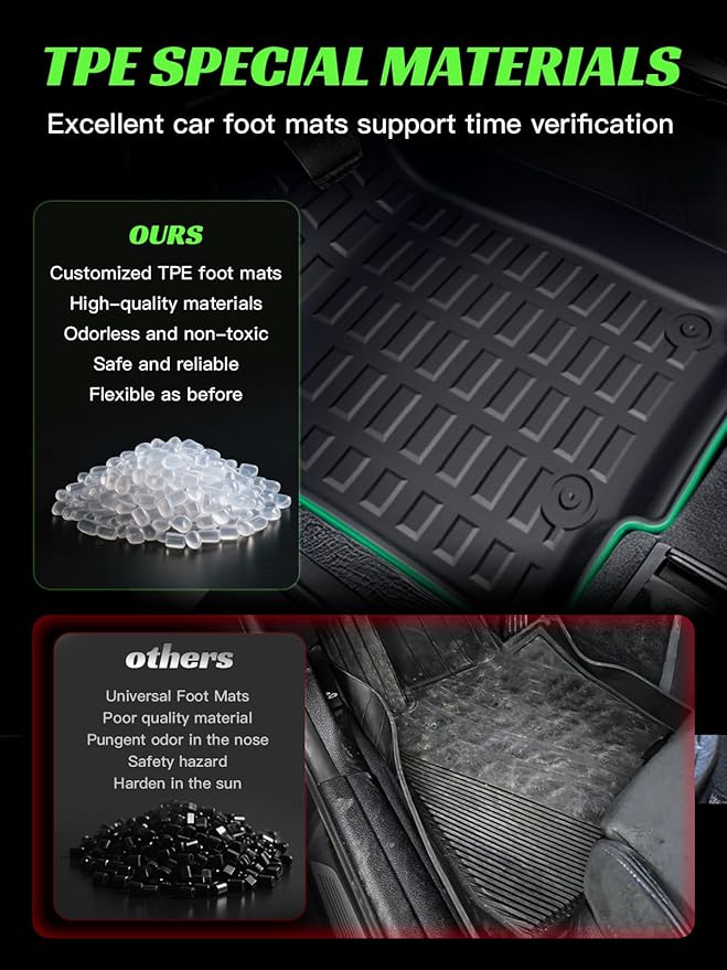 - 【TPE Material 】Our car floor mats are made of TPE (Thermoplastic Elastomer) material, which is 100% recyclable, odorless, non-toxic, wear-resistant and durable. Our floor liners for Jeep Gladiator features high heat resistance and flexibility, capable of adapting to all kinds of extreme weather conditions. There is no need to worry about the car mats cracking, curling or splitting, ensuring a safe and comfortable driving environment for you and your family.