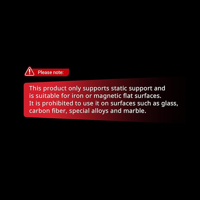 - Note: This product only supports static support and is suitable for iron or magnetic flat surfaces. It is prohibited to use it on surfaces such as glass, carbon fiber, special alloys and marble.
