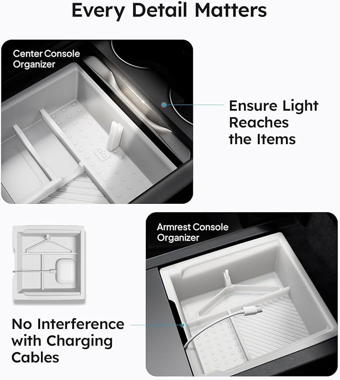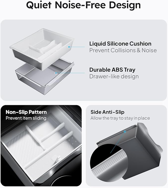 - 【Silent and Smooth Rides】No more annoying rattles! This Tesla accessory uses liquid silicone lining to reduce noise and protect items. Drive in peace, knowing your belongings are cushioned and won’t slide around in your Tesla New Model Y Juniper & Model 3 (2024-2025) Highland