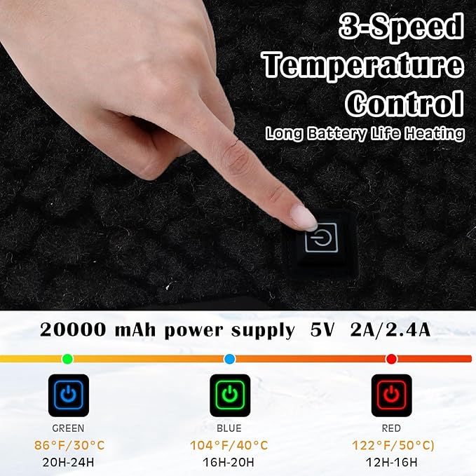 - 3 Adjustable Heating Levels: the heated chair pad offers 3 heating levels, easily adjustable via a button on the backrest; Choose between green (86°F/30°C), blue (104°F/40°C), or red (122°F/50°C); Powered by a 5V/2A USB port, it is compatible with most power banks (not included); With 3 adjustable heating levels, you can easily choose your comfort temperature based on personal preference and environmental conditions