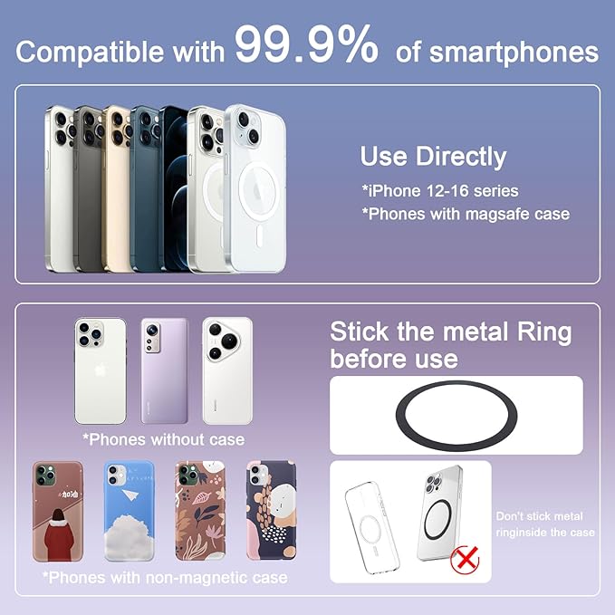 - Compatible Phone Models : Compatible with iPhone 16, 16 Pro, 16 Pro Max, 16 Plus, iPhone 15, 15 Pro, 15 Pro Max, 15 Plus, iPhone 14, 14 Pro, 14 Pro Max, 14 Plus, iPhone 13, 13 Pro, 13 Pro Max, 13 Mini, iPhone 12, 12 Pro, 12 Pro Max, 12 Mini, as well as MagSafe and MagSoft cases. Please note: We provide a metal ring for magnetizing other phone models or non-MagSafe cases. Compatible with iPhone 16, 16 Pro, 16 Pro Max, 16 Plus, iPhone 15, 15 Pro, 15 Pro Max, 15 Plus, iPhone 14, 14 Pro, 14 Pro Max, 14 Plus, iPhone 13, 13 Pro, 13 Pro Max, 13 Mini, iPhone 12, 12 Pro, 12 Pro Max, 12 Miniโฆ See more
