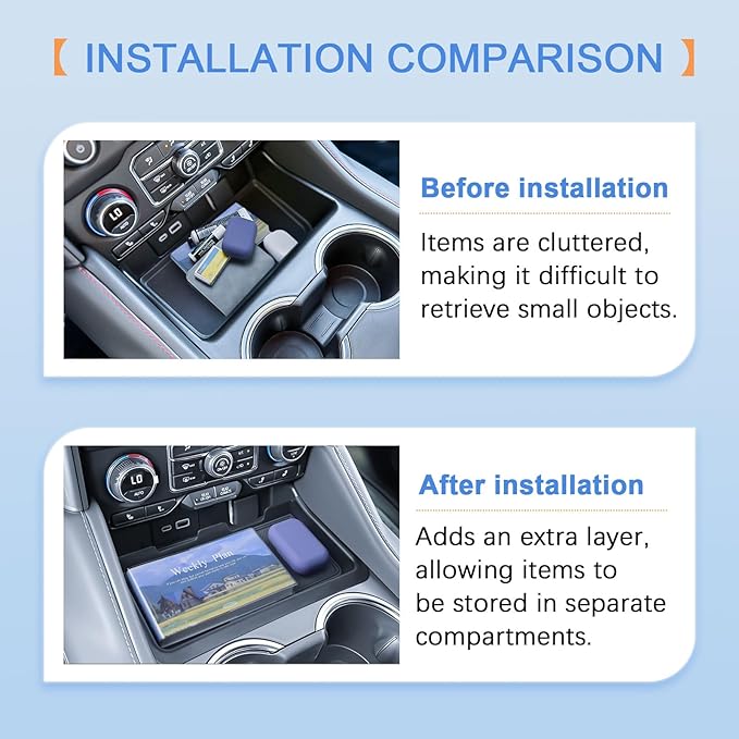 - Enhanced Double-Layer Storage: Features a top tray for quick-access items and a lower compartment for organizing small essentials. A Must-Have for Tahoe/Yukon/Suburban Owners!