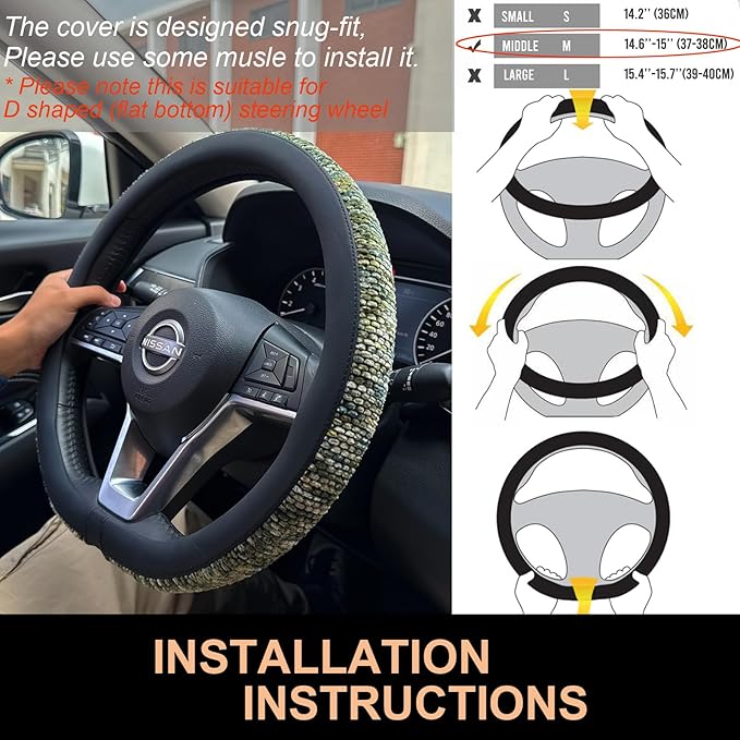 - SECURE NO-SLIP FIT for 14.5"-15" D SHAPED WHEELS: Tight fit for 14.5-15 inches (37-38 cm) flat bottom steering wheels. During installation, you may need to apply some force to stretch it over the wheel, after which it will fit seamlessly and reliably. For steering wheels with a larger grip circumference, we recommend sizing up for an optimal fit.