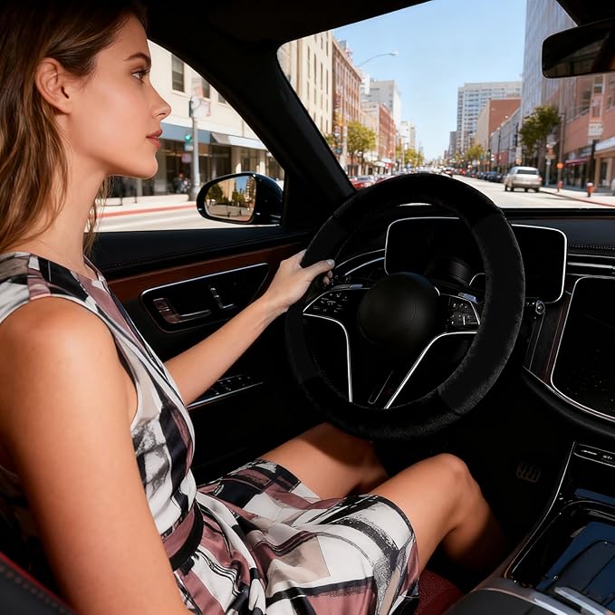 SEG Direct Car Steering Wheel Cover for Prius Civic Model 3 Model Y Camaro, Small Size 14-14.25 inch, Warm Plush, Summer Winter, Black