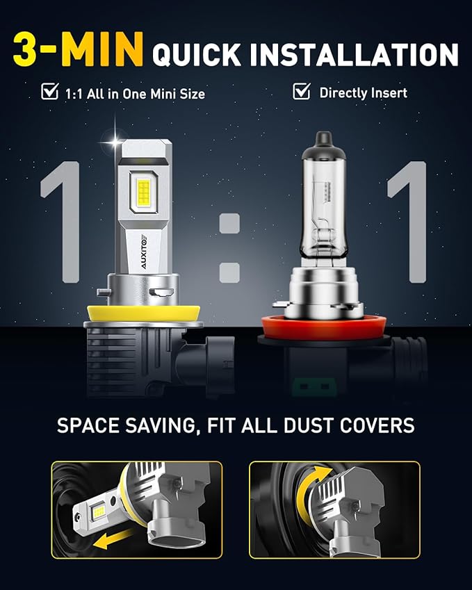 - Easy DIY Installation, No Tools Needed: Designed with a true 1:1 mini size, AUXITO 9005 H11 bulbs require no extra drivers or adapters. Simply swap your old bulbs for these in minutes—just twist out the original and twist in the new. You can complete the upgrade right in your garage.