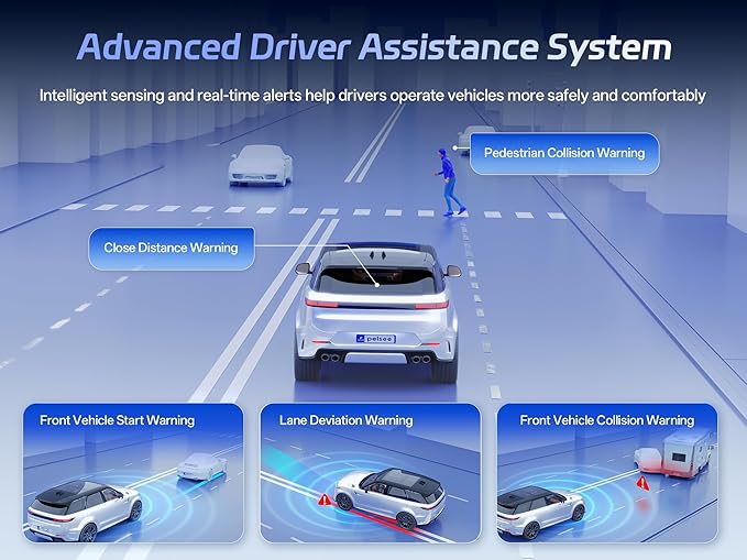 - 【ADAS Intelligent Driving Assistant】Continuously monitors the vehicle ahead for start-up, collision warnings for vehicles and pedestrians, and lane departure alerts. Upon detecting potential risks, car dash cam immediately issues voice alerts to help you avoid rear-end collisions and other impacts, enhancing driving safety through professional intelligent assistance