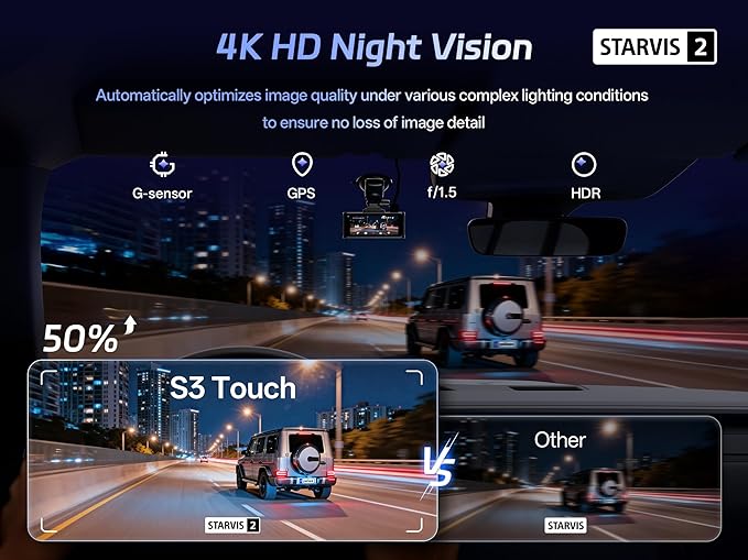 - 【STARVIS 2 Sensor & STARLIT Full Color Night Vision】The newly upgraded Starvis 2 is a highly sensitive low-light sensor with 4.6 times greater light sensitivity. Car dash cam efficiently gathers light and captures faint illumination, enabling full color night vision in extremely low-light conditions and revolutionizing traditional infrared night vision systems( Hardwire kit is needed )