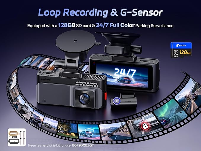 - 【24/7 Parking Monitoring & Loop Recording】Dash camera for cars Built-in high-sensitivity G-sensor gravity detection system instantly triggers video lockdown upon collision or scrape to prevent critical evidence from being overwritten; 24 hour continuous time-lapse recording compresses one hour into 30 seconds for low power consumption; Equipped with 128GB memory card for loop recording, expandable up to 256GB (not included)Hardwire kit is needed asin:BOF93QBZOT