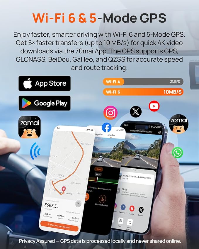 - 【Built-in 5-Mode GPS, Wi-Fi 6 & Smart Voice Control】The 70mai dash camera for cars features built-in 5-mode GPS for ultra-accurate location, speed, and route tracking. Equipped with Wi-Fi 6, file transfer through the 70mai App is up to 5× faster than standard Wi-Fi 4, reaching speeds up to 10 MB/s. Hands-free voice control lets you take photos, start recording, or lock important footage, making driving safer and more convenient