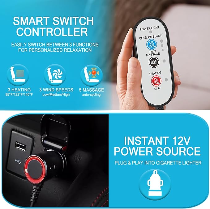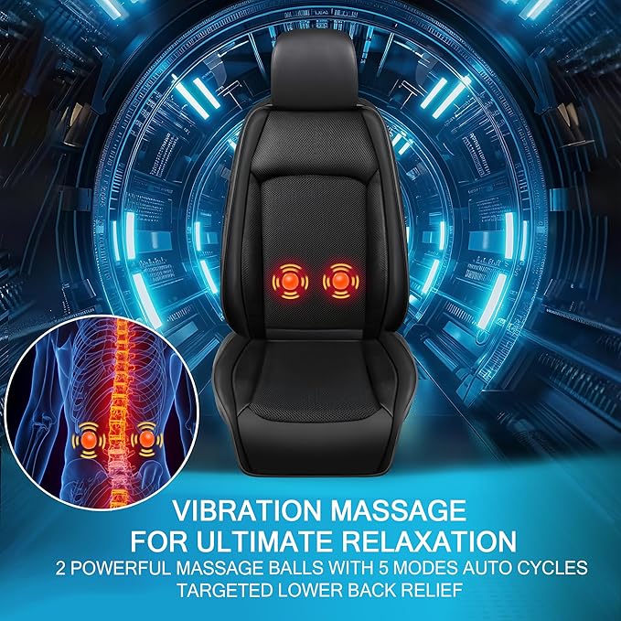 - 【3-in-1 Climate & Massage Comfort】Enjoy summer cooling with powerful air circulation, comfy temp for cold days, and soothing vibration massage targeting lower back tension—all in one versatile cooling car seat cover.