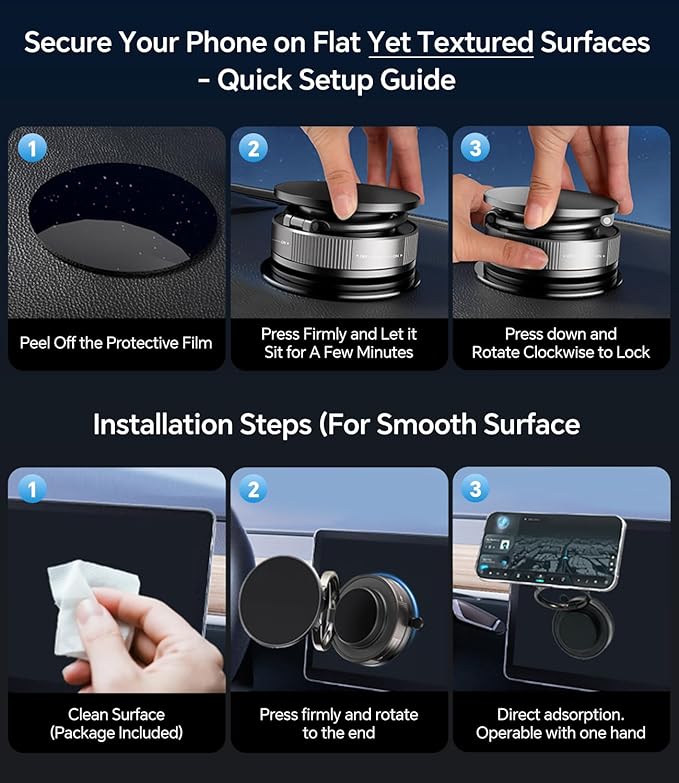 - 【Includes an Adhesive Pad for Flat But Textured Surfaces】This car phone mount works on even vinyl dashboards. It works best on windshields, glass doors, ceramic tiles, acrylic surfaces, polished metal, stainless steel, aluminum, chrome, and smooth painted walls (especially those with glossy or semi-gloss finishes). This car cell phone holder for hand is also suitable for polished marble or granite surfaces like countertops, as well as smooth, polished, or sealed wood and other plastic surfaces.