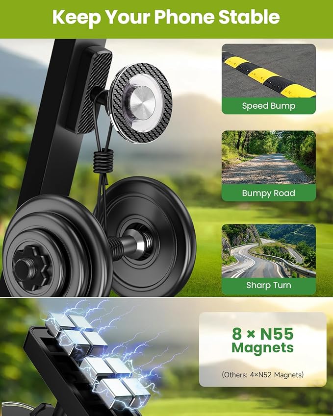 - Robust & Heavy Duty&Upgraded Magnets, keep your phone more secure: This phone holder for golf cart features upgraded materials and has passed a 1.5-meter drop test—boasting a sturdy structure built for long-term reuse. It's equipped with 28 upgraded N55 strong magnets, including 8 in the base (while other magnetic golf cart phone holder only have 4 in their bases). Its magnets are strong enough to keep your phone far more secure, whether you're driving on smooth roads or bumpy rides.