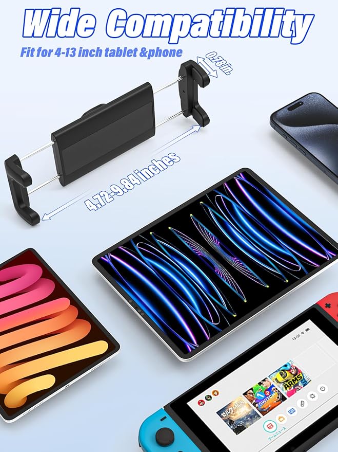 - 【Wide Compatibility】Universal tablet mount adjustable clip fits all 4.7-13'' devices. The clip size 4.7-9.64'' (11.93-24.5cm), Thickness 0.7'' (1.8cm), which makes the clip work with or without a case Can hold on tightly. Compatible with tablets such as ipad 11/air/12.9''/13" series; ipad mini 4/5/6; Galaxy Tab; Compatible with 99.9% of mobile phones on the market at the same time, Such as iPhone15 Pro Max/14/13/12/11 series; Galaxy Z Fold/Flip. GPS Navigator, etc.