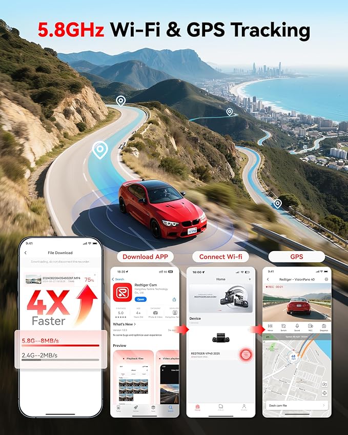 - [4x Faster 5.8GHz Wi-Fi & Built-in GPS] Ultra-fast 5.8GHz Wi-Fi offers video transfer speeds four times faster than common 2.4GHz Wi-Fi, allowing for quick access via the Redtiger Cam app. Preview, edit, and share footage from all four channels with ease. The built-in GPS tracker accurately logs your speed, route, and location. All data is seamlessly synced and accessible through the app, giving you full control from anywhere