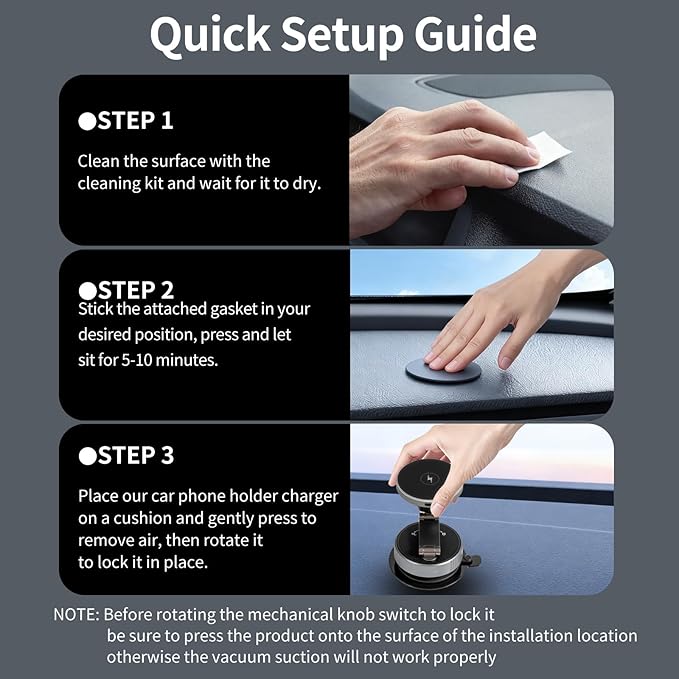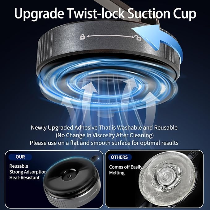 - 【2026 Upgraded Gel Suction Cup - Stable Hold】 Our vacuum magnetic car phone mount adopts advanced 4-layer nano gel suction cup base and vacuum locking technology, which is easy to reposition and free of residues. (It can hold up to 120 LBS and remains stable across a temperature range of -4°F to 140°F). Compared with other vacuum suction car phone holders, its grip is 80% stronger, and it can remain rock solid even on bumpy roads. (Tip: If the gel suction cup is accidentally soiled, just rinse it with clean water. After it is completely dried, it will restore its original viscosity and vacuum adsorption force.).