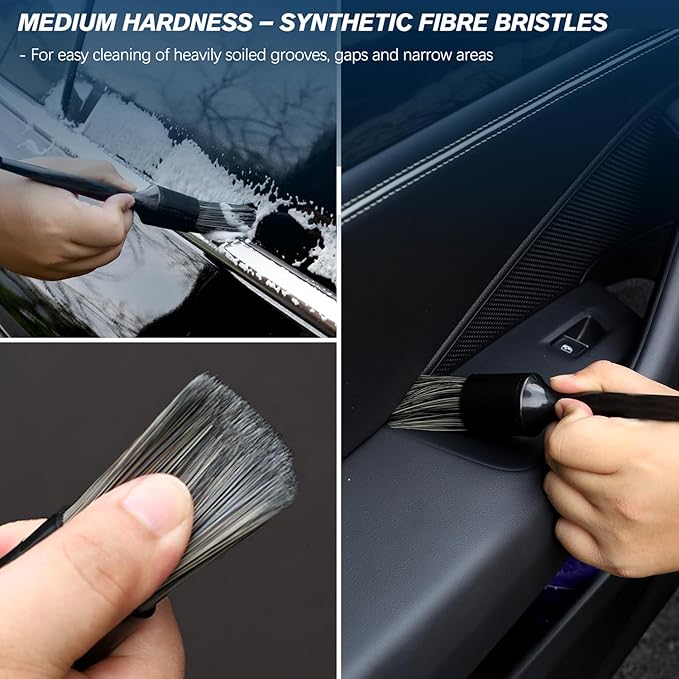 - ✅EFFICIENT & EASY CAR VALETING KIT BRUSHES — Practical car detailer brush set with two sizes of brushes: 1 large car dusting brush (23cm long with a 3.0 cm diameter), and 1 small auto finesse detailing brush (21cm long with a 2.5 cm diameter), to tackle automotive cleaning job that a microfibre wash mitt, sponge, or towel might miss. The black gap grout scrub brush allows you to easily reach tight spaces and enables precise cleaning even in hard-to-reach places for an expert shine.