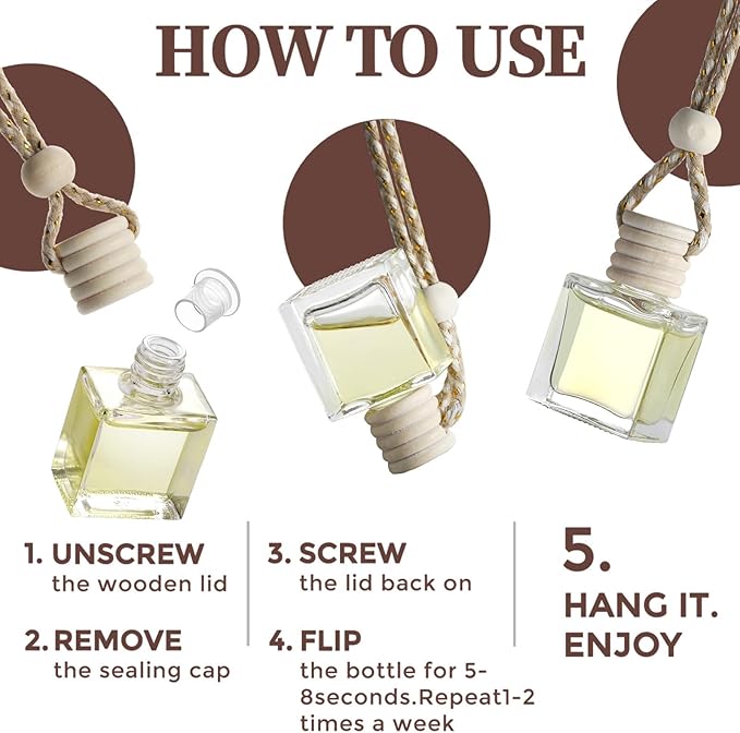 - 🔧 Easy to Use – Just Flip & Hang Anywhere:Simply remove the inner seal, screw the wooden cap back on, flip the bottle for 5–8 seconds, and hang. The adjustable string lets you place it on your rearview mirror, in your closet, or wherever you need a fresh boost.