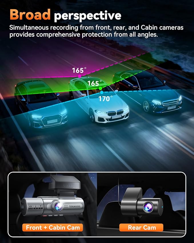 - 3 Channel Dashcam: Front, rear, and cabin cameras deliver near 360° panoramic coverage. The front camera has a 170° ultra-wide angle, while the rear and cabin cameras both feature a 165° wide angle—capturing broader road views and in-car details simultaneously for all-around protection