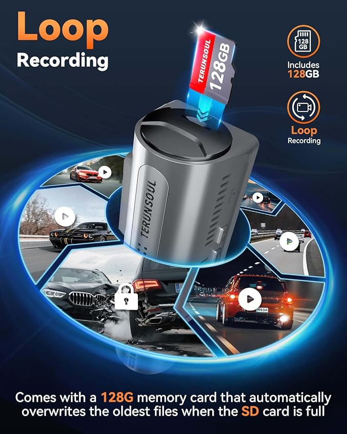 - Reliable Accident Capture: Pre-installed with a 128GB Memory Card . When a severe impact is detected by the collision sensor, collision footage is locked and saved automatically. When storage is full, it overwrites the oldest recordings for seamless loop recording
