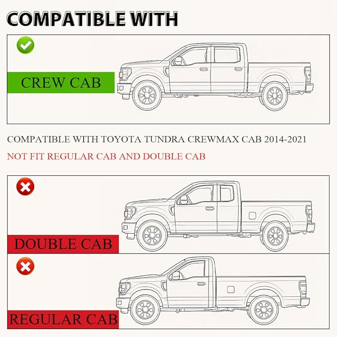 - COMPATIBILITY: Compatible with Toyota Tundra 2014 2015 2016 2017 2018 2019 2020 2021 (Only for CrewMax Cab).