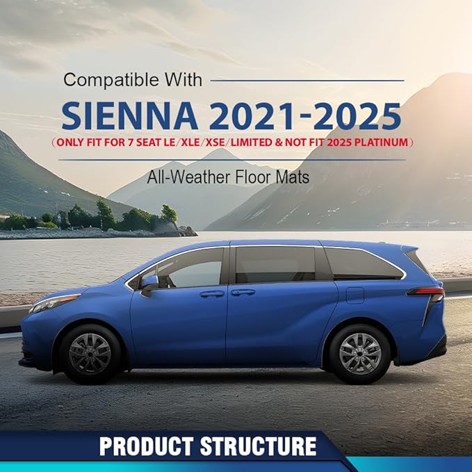 - Material Thermoplastic Elastomer (TPE) : Vehicle Service Type Compatible with Toyota Sienna 2021-2025(Only Fit 7 Seat LE/ XLE/ XSE/ Limited, Not Fit 2025 Platinum) Compatible with Toyota Sienna 2021-2025(Only Fit 7 Seat LE/ XLE/ XSE/ Limited,… See more