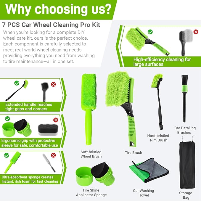 - Professional Shine Right in Your Driveway - Skip the pricey car wash,get pro-level results at home. This wheel brush set powers through brake dust, road grime, and grease, leaving your rims spotless and gleaming every weekend wash.