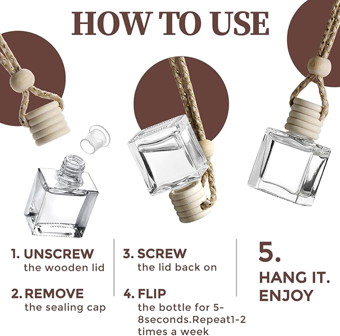 - 🔧 Easy to Use – Just Flip & Hang Anywhere:Simply remove the inner seal, screw the wooden cap back on, flip the bottle for 5–8 seconds, and hang. The adjustable string lets you place it on your rearview mirror, in your closet, or wherever you need a fresh boost.