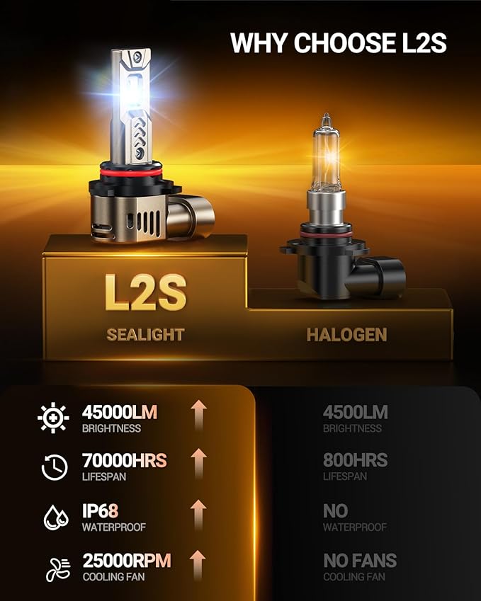 SEALIGHT L2S 9012 LED Light Bulbs, 10X Super Brighter 6500K Cool White 9012 HIR2 LED Headlight Bulb with Fan, 1:1 Halogen Mini Size, Plug N Play, Pack of 2