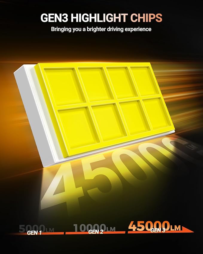 - 1000% Exceptional Brightness: Featuring 16 advanced chips per bulb and an incredible 45,000LM brightness per set. Powered by the latest technology, these headlights efficient illumination, ensuring optimal visibility and safety during nighttime drives